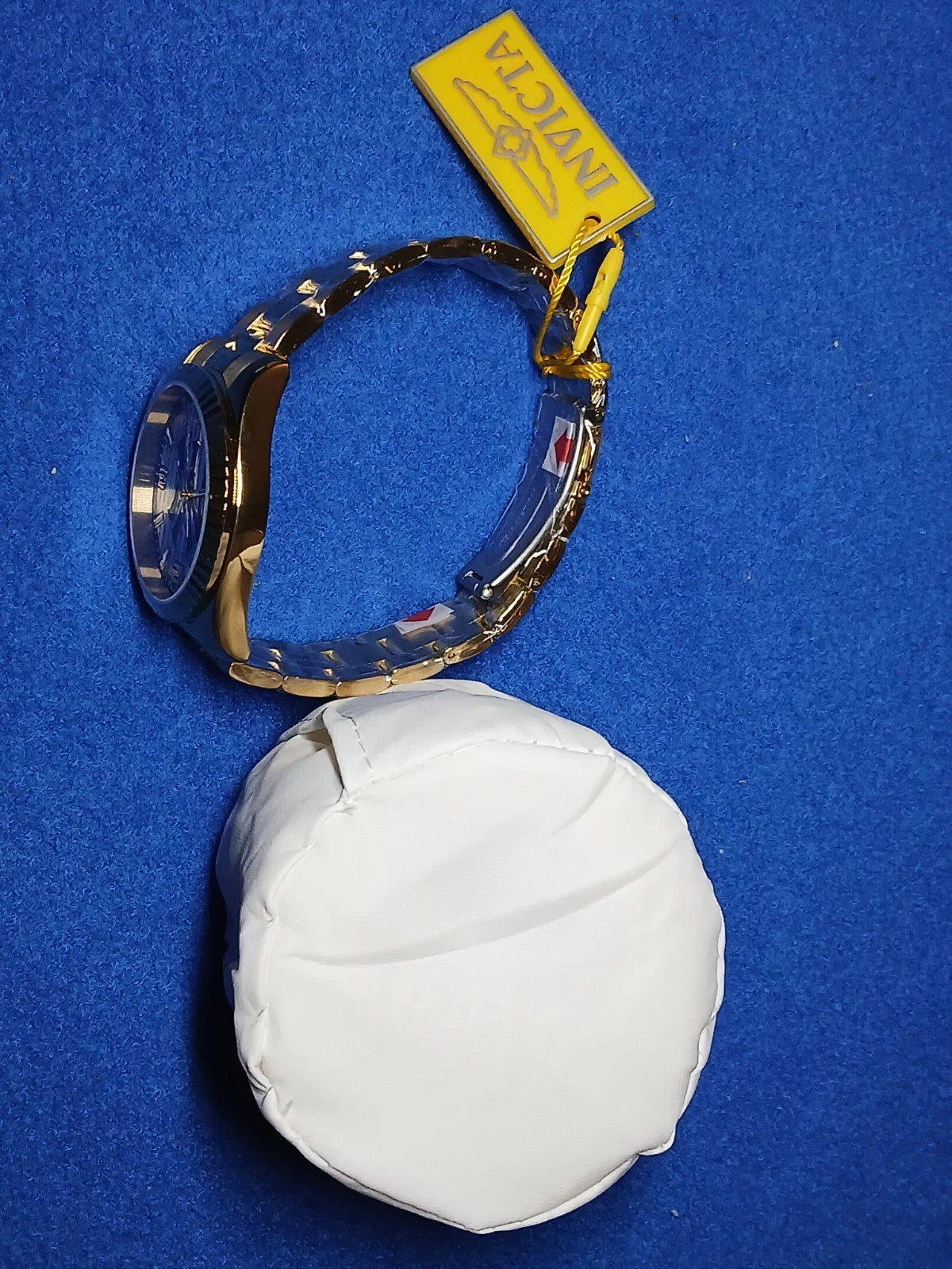 The Invicta 49864 Specialty New York Yankees Edition 43mm Gold Dial is a stylish and modern wristwatch designed for men. The watch features a gold stainless steel case with a polished finish and a fixed gold bezel. The dial has a unique logo pattern, adding a touch of sporty style, perfect for fans of the New York Yankees. With a quartz movement and water-resistant features, this casual watch is not only functional but also durable for everyday wear. It comes in its original packaging from the brand Invicta, making it a great gift option for any watch enthusiast.